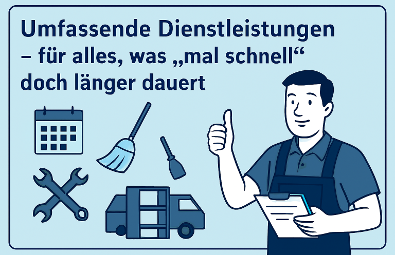 Ob Projekte, die plötzlich größer werden als gedacht, Aufgaben, die keiner so richtig übernehmen will, oder Dinge, die einfach zuverlässig erledigt gehören – ich pack’s an. Von A wie Alltagshelfer bis Z wie „zu zweit geht’s schneller“: Ich organisiere, koordiniere, repariere, montiere, pflege, fahre, berate und bringe Ordnung ins Chaos.