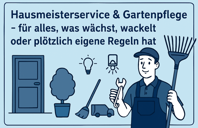 Wenn die Hecke wieder „künstlerisch frei“ geschnitten ist, das Laub eine WG im Hof gegründet hat oder die Glühbirne im Treppenhaus beschlossen hat, in Rente zu gehen – ich kümmere mich darum. Ich mähe, fege, schneide, tausche, kontrolliere und halte alles in Schuss, was Haus und Garten so an Überraschungen bereithalten.